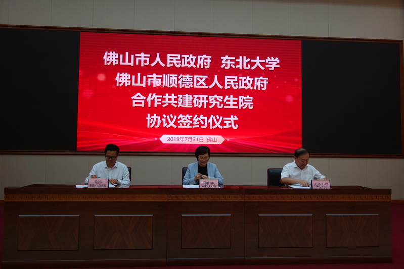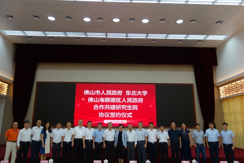 2019年7月31日,赵继校长率队访问佛山,徐峰副校长、广东省校友会会长陈伯君、研究生院常务副院长王兴伟、校长办公室主任刘延晖、研究生院培养处处长徐新阳、发展规划与学科建设处处长李鸿儒、科学技术研究院院长王强、科技成果转化办公室主任刘海波、人事处处长张皓、计财处处长曲桂贤、基建处处长金畅、工业人工智能研究院副院长付俊、广东省校友会副会长蒋建业、深圳校友会秘书长杨波、对外联络与合作处副处长刘佳等同行,与佛山市人民政府、佛山市顺德区人民政府签订合作共建研究生院协议。