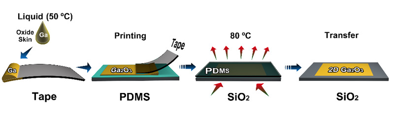 低维纳米复合器件特别是二维范德华异质结体系因其独特的量子新物态(拓扑保护、新型准粒子、强关联等),吸引无数材料与物理领域研究人员的关注,其中大多数镓系二维材料不具有石墨层状结构,无法用传统的外延生长和剥离技术获得,制备上受到严峻的挑战,也是目前一个研究热点。针对这些问题,研发团队从液态Ga金属的表面自钝化机理出发,创新性地提出一步法同时实现Ga金属的氧化和剥离,开发出了以PDMS为衬底,在其表面直接印刷制备二维氧化镓(Ga2O3)非晶的合成技术(见图1);同时利用PDMS优良的转移特性,可以便捷地将2D Ga2O3非晶转移到任意衬底。这一创新性的思路也得到了编辑和审稿人的高度评价,他们认为这将是一个快速发展的领域,该工作的研究成果印象深刻,毫无疑问将引起该领域研究人员的广泛兴趣。(This is a rapidly growing field, and the presented results are impressive and will without doubt stimulate significant interest in the field.)。