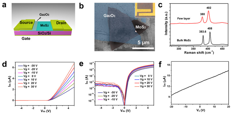 图42DGa2O3/MoS2范德华异质结场效应晶体管的模型实物图以及相应的性能曲线
