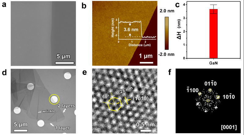 图3大尺寸二维氮化镓晶体的表面形貌、厚度和晶体结构