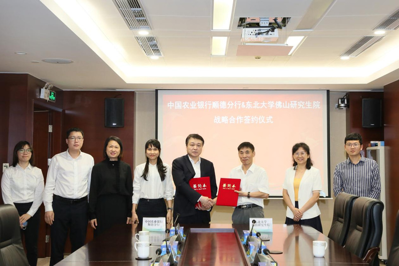 2022年5月12日下午,《东北大学佛山研究生院与中国农业银行股份有限公司顺德分行战略合作协议》签署仪式在中国农业银行顺德分行举行。佛山研究生院院长徐新阳、计划财经部部长李煜,中国农业银行顺德分行行长郑庆文、副行长谈洁明、分行机构业务部总经理马健敏、分行资深专员,北滘支行行长邱海渊、北滘支行副行长郑家翠出席签约仪式。