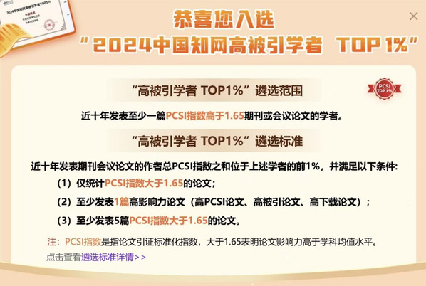 “2024中国知网高被引学者”采用的评价指标为作者发表论文的加权总PCSI(Paper Citation Standardized Index,论文引证标准化指数)。选取论文的条件是该论文的PCSI需高于理论平均值,权重与合作作者数量以及作者署名顺序相关。