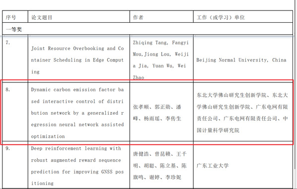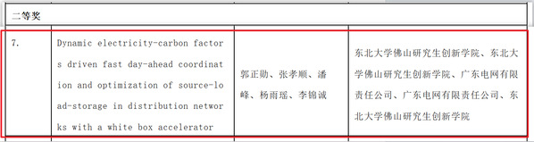 一等奖优秀论文:Dynamic carbon emission factor based interactive control of distribution network by a generalized regression neural network assisted optimization,发表在高水平能源期刊《Energy》,主要成员包括张孝顺(团队负责人)、郭正勋(博士研究生)。