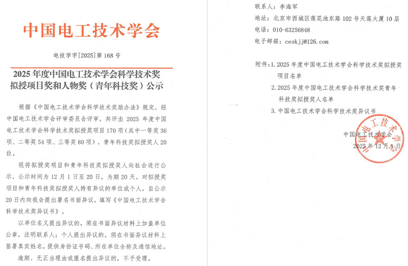 2025年12月1日,中国电工技术学会公示了2025年度中国电工技术学会科学技术奖拟授项目奖和人物奖名单。其中,我院人工智能与智能电网实验室团队负责人张孝顺副教授参与的两个项目,均获得2025 年度中国电工技术学会科技进步奖二等奖。获奖项目分别为《电力碳排放高时空分辨率计量关键技术及减碳应用》《面向多层级新能源市场化运行的全景感知与协同调控关键技术及应用》,项目联合中国南方电力调度控制中心、广东电网公司、云南电网公司、清华大学、华南理工大学等多家高校科研单位团队,在电碳计量及应用、新型电力系统调控等关键技术取得了创新性成果。