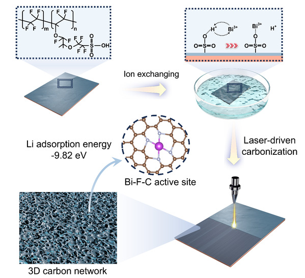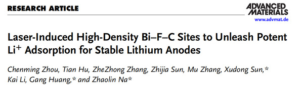 近日,我院那兆霖副教授、孙旭东教授与中国科学院长春应用化学研究所黄岗研究员联合研究团队在国际顶级期刊《Advanced Materials》(影响因子27.4,中科院1区)上发表了一项突破性研究成果。针对单原子材料在高负载下易团聚以及锂金属负极亲锂性不足的难题,研究团队首创了“静电预组装与激光驱动碳化”(EPO-LDC)策略。该策略利用超快激光淬灭技术,成功在几秒钟内制备出具有9.63wt.%超高负载量的铋(Bi)单原子级分散材料。该材料通过独特的Bi-F-C位点释放出惊人的-9.82eV锂吸附能,实现了锂的均匀沉积,显著提升了电池的循环寿命。论文以《Laser-Induced High-Density Bi-F-C Sites to Unleash Potent Li+ Adsorptionfor Stable Lithium Anodes》为题,为工业级高负载单原子材料的快速制备提供了全新范式。